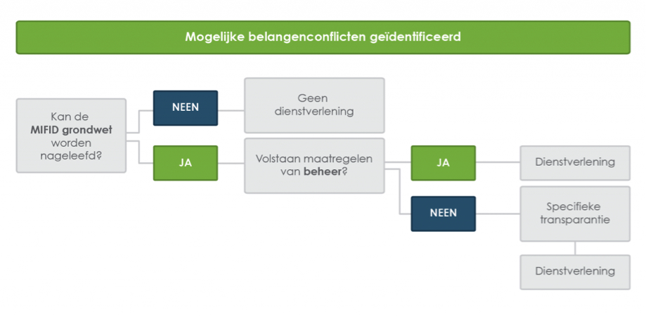 De wettelijke regeling omtrent belangenconflicten is een aanvulling op de algemene MiFID-grondwet. Deze grondwet wordt door ons kantoor geëerbiedigd door zich loyaal, billijk en professioneel in te zetten voor de belangen van de klant bij het verlenen van diensten van verzekeringsbemiddeling.